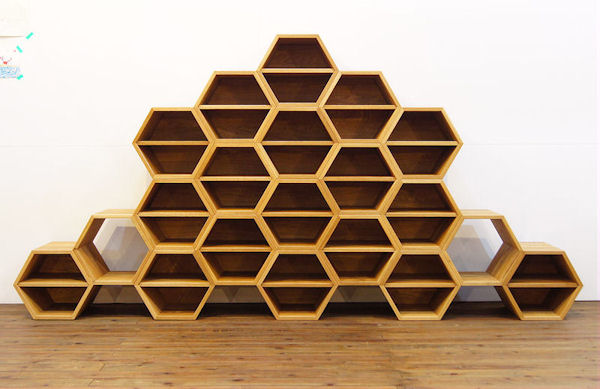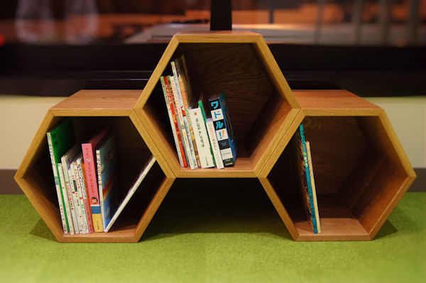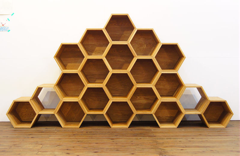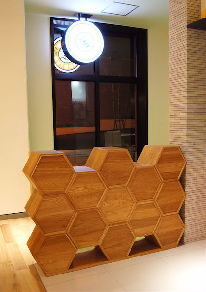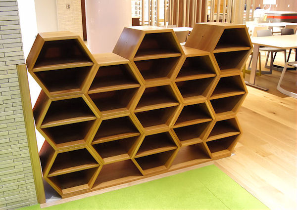 『玉川学園』様の食堂のために作らせていただきました。玉川学園といえば農学部。そして蜂蜜。 食堂『KEYAKI』のコンセプトは「蜂」。 ということで蜂の巣状の棚を作りました。キッズコーナーの靴入れとして使われます。 六角形の箱は組み換え自由で、遊び心で様々な形状に変化できます。互いにネジで固定されるので崩れることはありません。 背板のない棚の組み合わせなら、部屋の中心に置いてパーテーションにもなりそうです。 棚板は抜き差し自由です。もちろん斜めにも差せます。 大変丈夫ではありますが階段としては使えません^^ |
