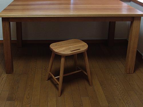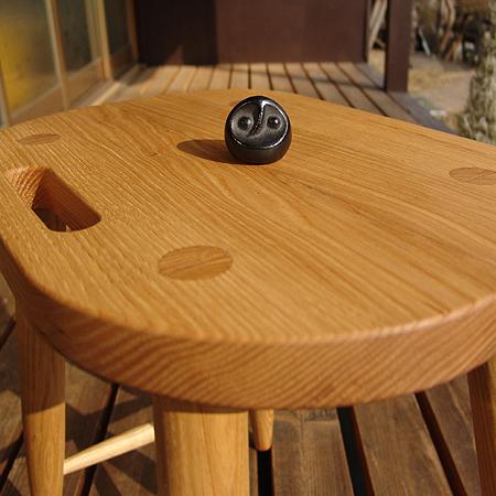 日常で大変重宝する軽くて丈夫で座りやすい腰掛。座面が平面なので踏み台としても活躍します。さらにソファの横に置けば、 ちょっとしたサイドテーブルにも。来客時の非常用椅子としても。活躍場面の多い腰掛けです。 持ち運びに便利なようくりぬいた穴が口、脚の強度を増す貫通クサビ構造が目の愛嬌のある顔に見えます。 |