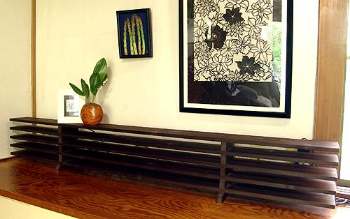 | 白い漆喰壁の純和風の部屋で使うので、直線的な意匠と黒い塗装にした。 飾り棚ではあるが、壁のコンセントから出る無数の配線を隠す目的もある。 等間隔の隙間が軽快な雰囲気をかもす。上面には好みの陶器や花や雑貨などを置いて楽しめる。 |