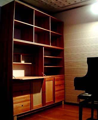 | ピアノ教室をされている女性からのご依頼。上二段の棚は楽譜が収まる寸法。中段は開閉式の机と可動式の棚で構成される。 ピアノの椅子に座ったまま、ちょっとした書物ができる。下段は雑誌が収まる大型の引出しを含む六杯の引出しと、 開き戸式の収納部から構成。開き戸の中はやはり可動式の棚が設けられている。上段、中段、下段はそれぞれ分解可能。 |