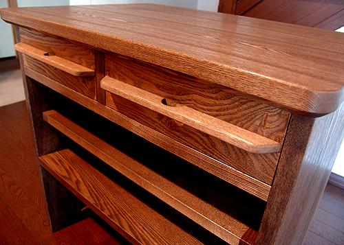 | 「居間に合うファックス台を」というご依頼でした。濃い色の高級家具が並ぶ広い居間に置かれます。それまでFAXは、間に合わせの白い鋳物製円卓に乗せられていて、 この部屋の雰囲気には合っていませんでした。濃い系が合うと思い色は柿渋に弁柄の黒を混ぜ着色。 カシュー漆で仕上げ高級感を出しました。タモ材とこの仕上の組合せはエミケン定番商品の <ちゃぶ台90> でも採用している一押しの仕上げ法。 とても雰囲気良く仕上がりました。上部の引出しはA4用紙が入る寸法。その下は棚になっていて、中央の棚板は取外し可。 電話帳やルーターなどの機器類も仕舞えます。 |