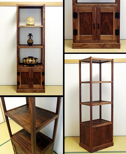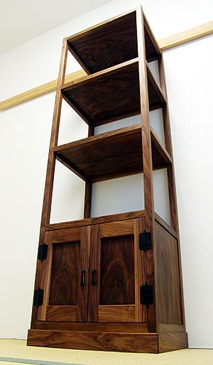 四方棚もご注文いただいた。 四方棚はその性質上「裏側」がない。最下段の収納部の鏡板には全て無垢材を使用。とても高級な作りである。金物には <階段箪笥>でも使用した、 東京神田『西川商店』の高級金物を使用。棚部の板にも6mm厚の無垢板を使用。と、とことんこだわってみた。 よくある黒檀製の黒光りする四方棚とは違い、重厚ではあるが艶消しの仕上げによりアッサリした雰囲気になったのではと思う。 |