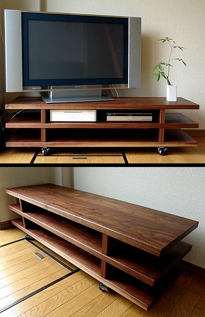 (テレビボード) 材質: ブラックウォールナット 仕上: 木油 寸法: 高350mm×巾1300mm×奥400mm 参考価格: ¥160,000(税抜、送料別) |