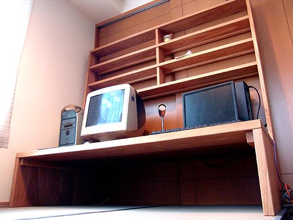 | 恵比寿のマンションにお住まいのご夫婦からのご依頼。夫婦で一緒に使うPCデスクを製作。それぞれのパソコン類を採寸し、 機器が納まるように設計。ご夫婦のスタイルとして「座卓式」が良いとのことからこの仕様になった。 これだけ大きいデスクであるが座卓式なので部屋への圧迫感が少ない。 |