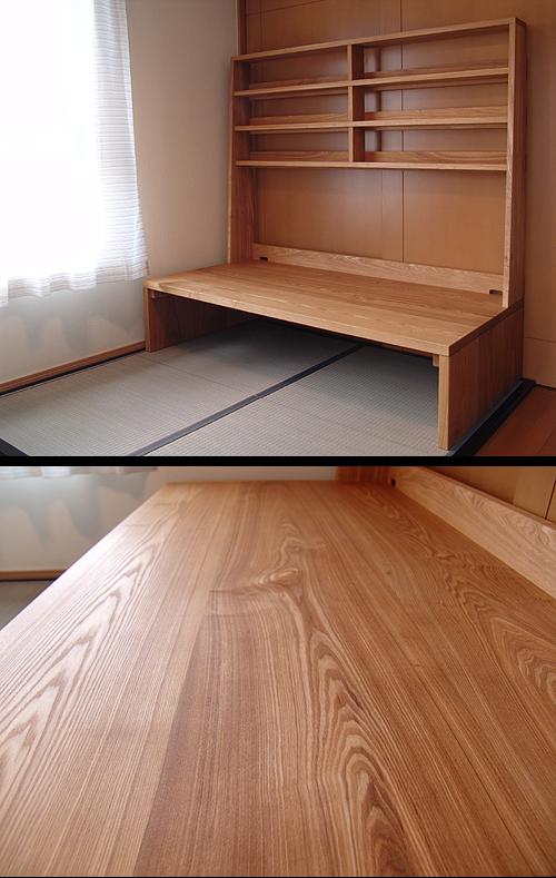 (PCデスク) 材質: タモ 仕上: 柿渋 木油 木蝋 寸法: 全高1513mm(座卓高360mm)×巾1600mm×奥800mm 参考価格: ¥320,000(税抜、送料別) |