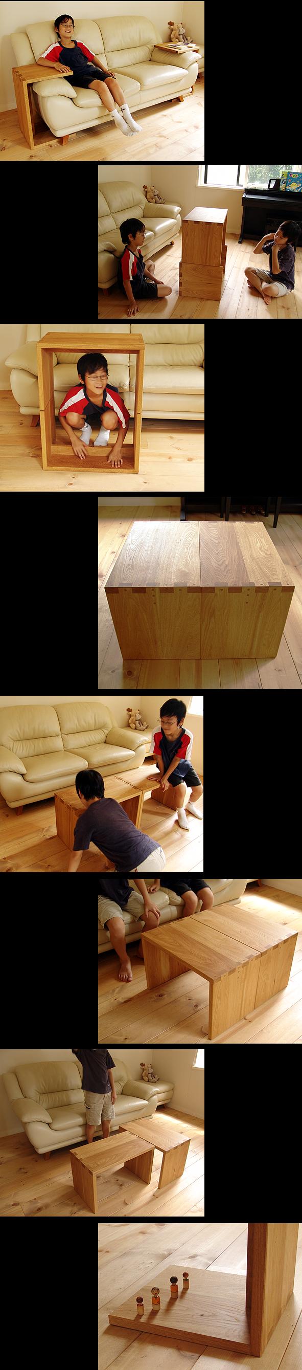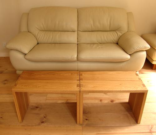 当初この条件で既製品をお探しでしたが、意匠、機能ともに満たす製品は見つからなかったそうです。 製作前、お宅に伺い部屋を拝見させていただき、「美術品陳列館(ギャラリー)みたいだなぁ。この空間には簡素な無垢の家具が よく映えそうだ。」と感じた。ご本人の出版する料理の本の撮影はほぼご自宅、ということで「なるほど」。 この部屋にある電子ピアノ、隣続きの食堂にある食卓と椅子がナラだったので、材質は迷わずナラに決まった。 納品してご要望通りの機能を満たしたのは言うまでもなかったが、面白かったのは、こちらの双子のお子様が「低卓」を発見し、 積木感覚で遊びだした事だった。意匠が簡素だと用途が増える、と言う面白い現象である。 あと5個ぐらいあればもっと面白そうですね。 そのうちこの「低卓」も料理本に登場するそうです。楽しみにしております。 |