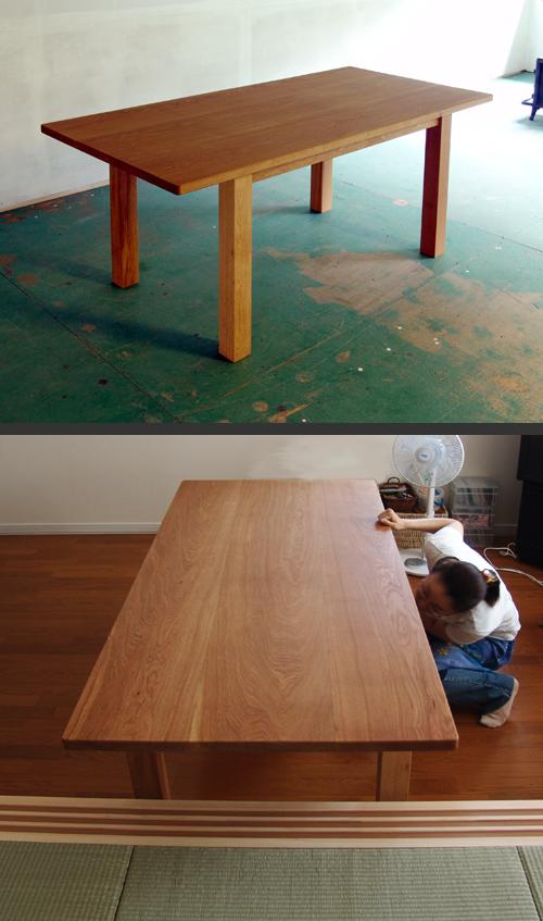 遅れてしまうという程の閑静な場所。 前出の 食卓 <0107> と同じく、 一段高くなった和室に接する居間食堂(リビングダイニング)に置かれる。天板長手方向の寸法より脚が左右それぞれ250mm入っている。 和室に脚を接すると天板が和室側に大きく張り出し座卓となる。座ってみると実に足元に開放感があり、ここが一番の特等席 だということが解る。お父さん席である。渋茶をすすりながらここにあぐらをかき、椅子に座った息子二人に「今日はどうだった?」 などと問えば、オヤジの威厳大であること間違いなし。素敵な家族のやりとりが目に浮かぶ。 |