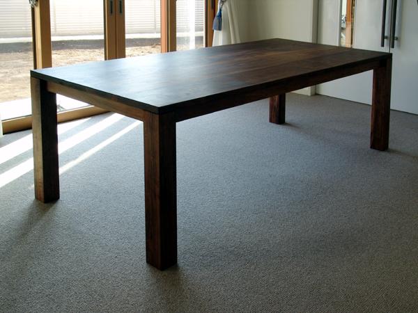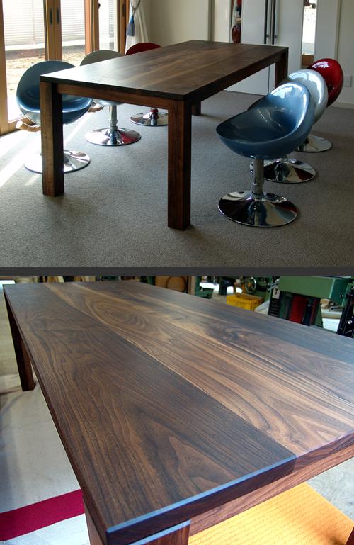 | つくば市の新築のお客様からのご依頼。鉄筋コンクリート造の頑丈な建物。内装は真っ白に塗られ、カーテンや絨毯は豪華な雰囲気。 その空間に置かれる食卓。見劣りしないように、凛とした逞しい存在感のある物にしたいと思った。材質はやはりウォールナットしか ないように思えた。6人が充分余裕を持って食事ができるように、とのことで、天板寸法はこの寸法に。長手方向に三人腰掛けるので、 食卓の脚は天板の四隅ぎりぎりに配置。短手方向も余裕を持って一人腰掛けられる。脚下に補強の構造の一切ないごくごく簡素な意匠。 エミケンが最も好きな意匠。贅肉をそぎ落とし、しかし強度は充分。広大な天板に負けないよう、脚は極太。 存在感、実用性、耐久性全てに優れた物に仕上がったと思う。 |
