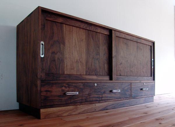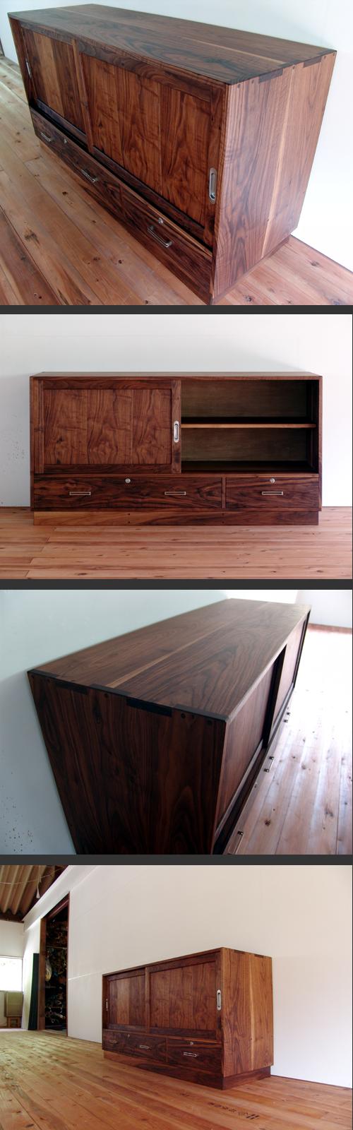 (ローキャビネット) 材質: ウォールナット 仕上: オイル 寸法: 高730mm×巾1400mm×奥450mm 仕様: カギ付引出し二杯/引き戸内右側可動式棚板一枚/背板コンセント用穴 参考価格: ¥230,000(税抜、送料別) |
