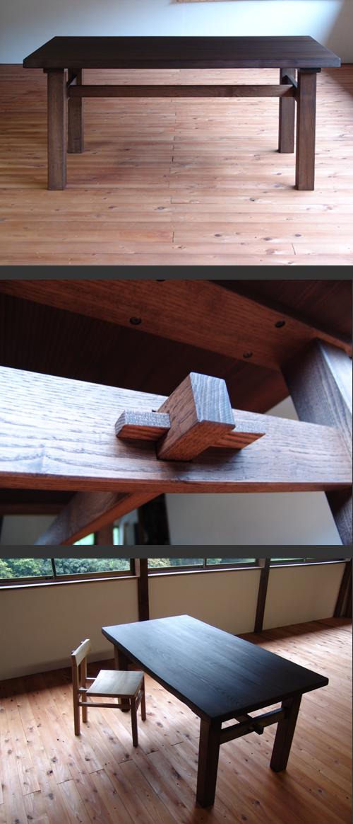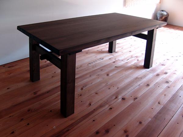 (テ−ブル) 材質: 天板/カツラ 脚/クリ 仕上: 柿渋 弁柄(黒) 木油 寸法: 高700mm×巾1500mm×奥840mm 参考価格: ¥180,000(税込、送料別) |