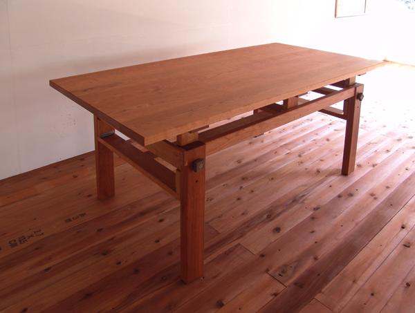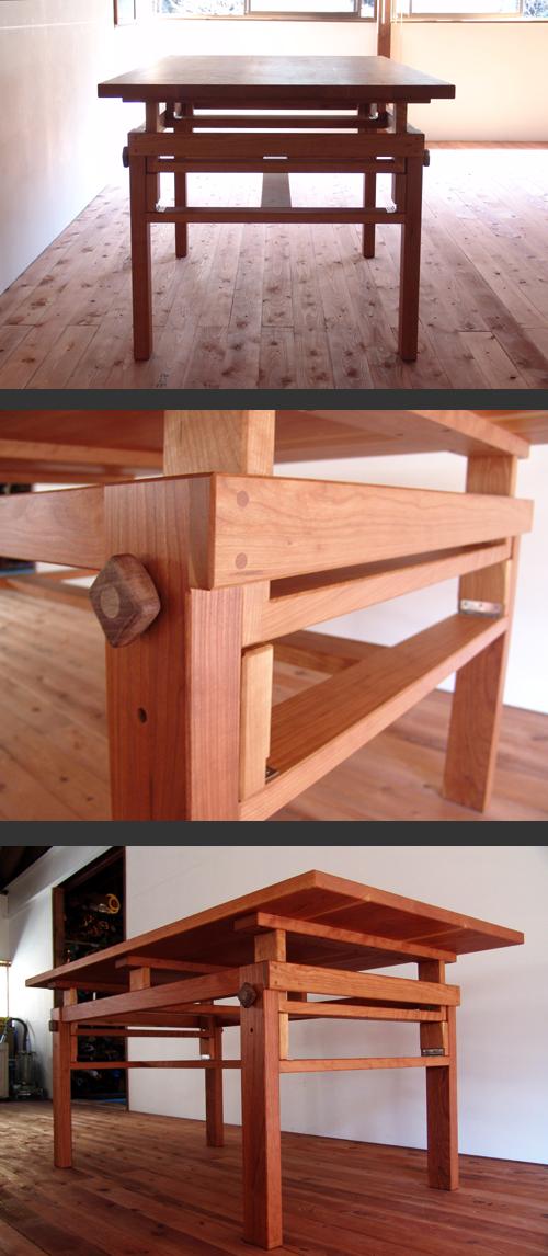 | 横浜の新築一戸建てにお住まいのご夫婦からのご依頼。普段はテーブルとして使用、パン教室開催時には作業台としてつかえるもの、 という大変面白いご依頼だった。ガスショック式の市販の脚を使えば簡単この上ない仕様であるが、お客様のご希望はあくまで「木製で」。 エミケンとしても金属製の市販品に頼ることだけはしたくなかった。しかし作業台となると激しい使用も想定しなければいけない。 構造に懲りすぎ貧弱な物になってしまってもしょうがない。試作を作った上で納得のいく構造にたどり着くことが出来た。 固定用ネジの頭はウォールナットで作成。ちょっと洒落てみた。エミケンの代表作がまたひとつ増えたと思う。 |