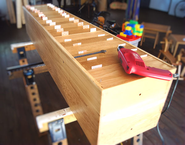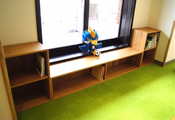 『玉川学園』様の食堂のために作らせていただきました。 キッズコーナーの窓辺全体を本のコーナーにし、その棚に腰掛けることもできるように、とのご要望でした。 壁面にコンセントがあるので、その部分は背板に穴をあけました。 本と本の間から覗く背板に「木」を感じてもらいたくて、背板はナラ材の無垢板で製作しました。 壁際に置いてしまうのがもったいないくらい後ろ側もかっこいいです。 |